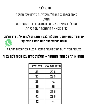* החלפת מידה חינם תוך 14 ימים ממועד קבלת הנעליים.